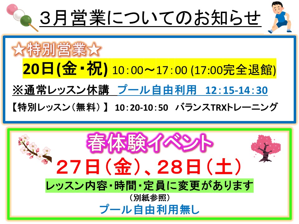 3月20日(金)特別営業のお知らせ 2026 2/26 お知らせ 2026年2月26日 3月20日(金)は特別営業を行います! 営業時間:10:00~17:00プール自由時間:12:15~14:30特別レッスン(無料):10:20~10:50 バランスTRXトレーニング ぜひお越しください! お知らせ